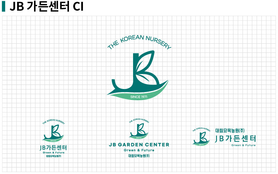 JB가든센터의 로고는 대표님의 이름 초성을 활용한 심벌로, 식물의 잎을 형상화해 자연 친화적 이미지를 담았습니다.