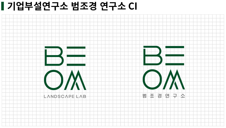 대표 이니셜 BEOM 각각의 알파벳을 도식화 하여 표현했으며 짙은 청록색의 색상을 통해 조경을 상징하며 업종의 전문적인 이미지를 나타내었습니다.